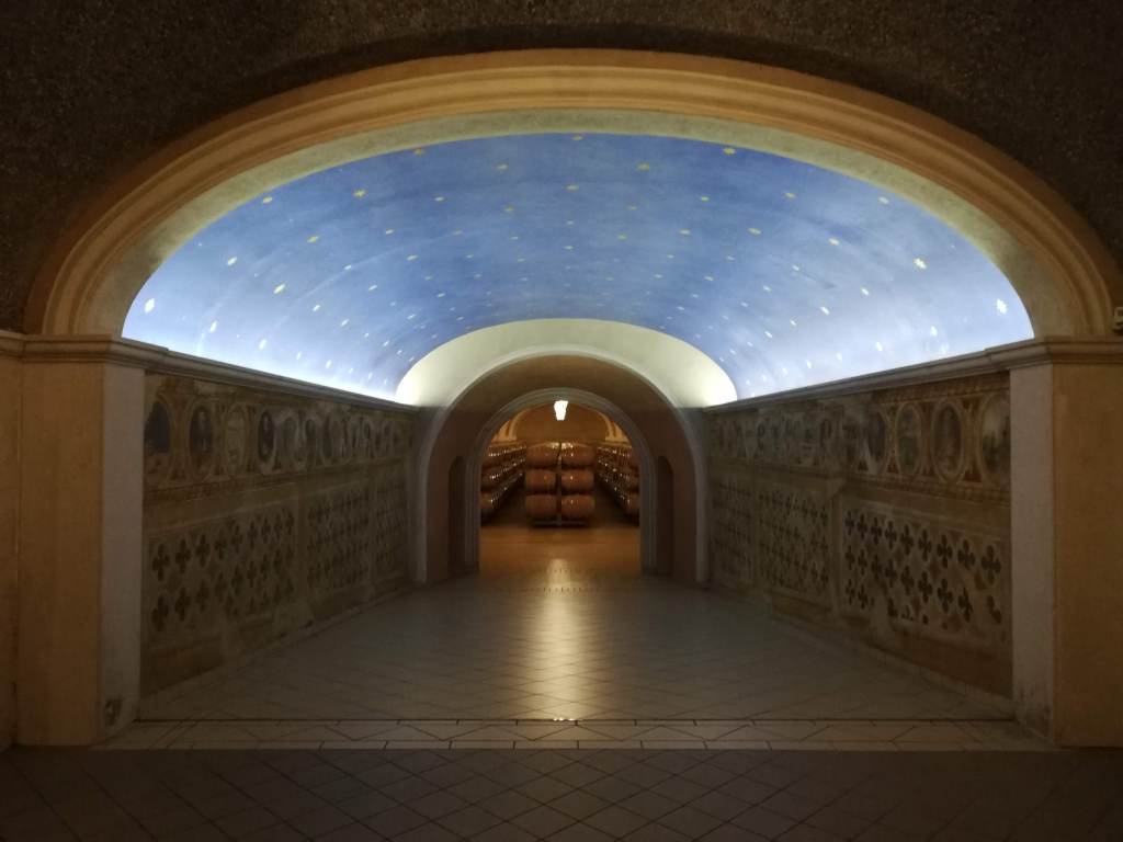 La cosa che mi ha affascinato di più di tutta la struttura è stata la capacità di unire, in modo egregio, antico e moderno. Le stanze di nuova costruzione, la barricaia in primis, trasudano un non so che di mistico ed etereo, complici anche i vetri finemente decorati che dividono le diverse zone e nascondono i macchinari super tecnologici. Alla barricaia si accede attraverso un corridoio affrescato: una volta entrati, gli occhi si perdono lungo le file di barrique che custodiscono quasi tutti i vini dell’azienda.
